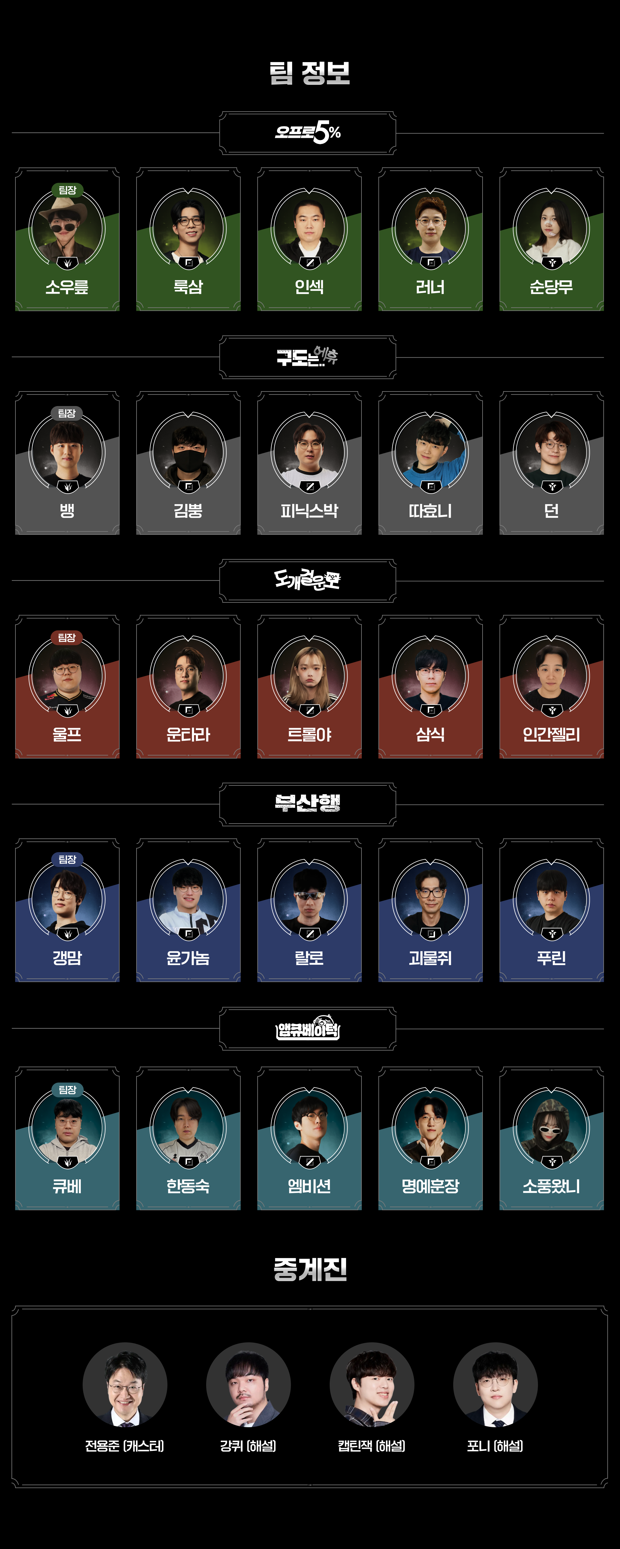 울프, 소우릎, 뱅, 갱맘, 큐베가 팀장이 되었고요, 각 팀마다 전력도 정말 탄탄합니다.