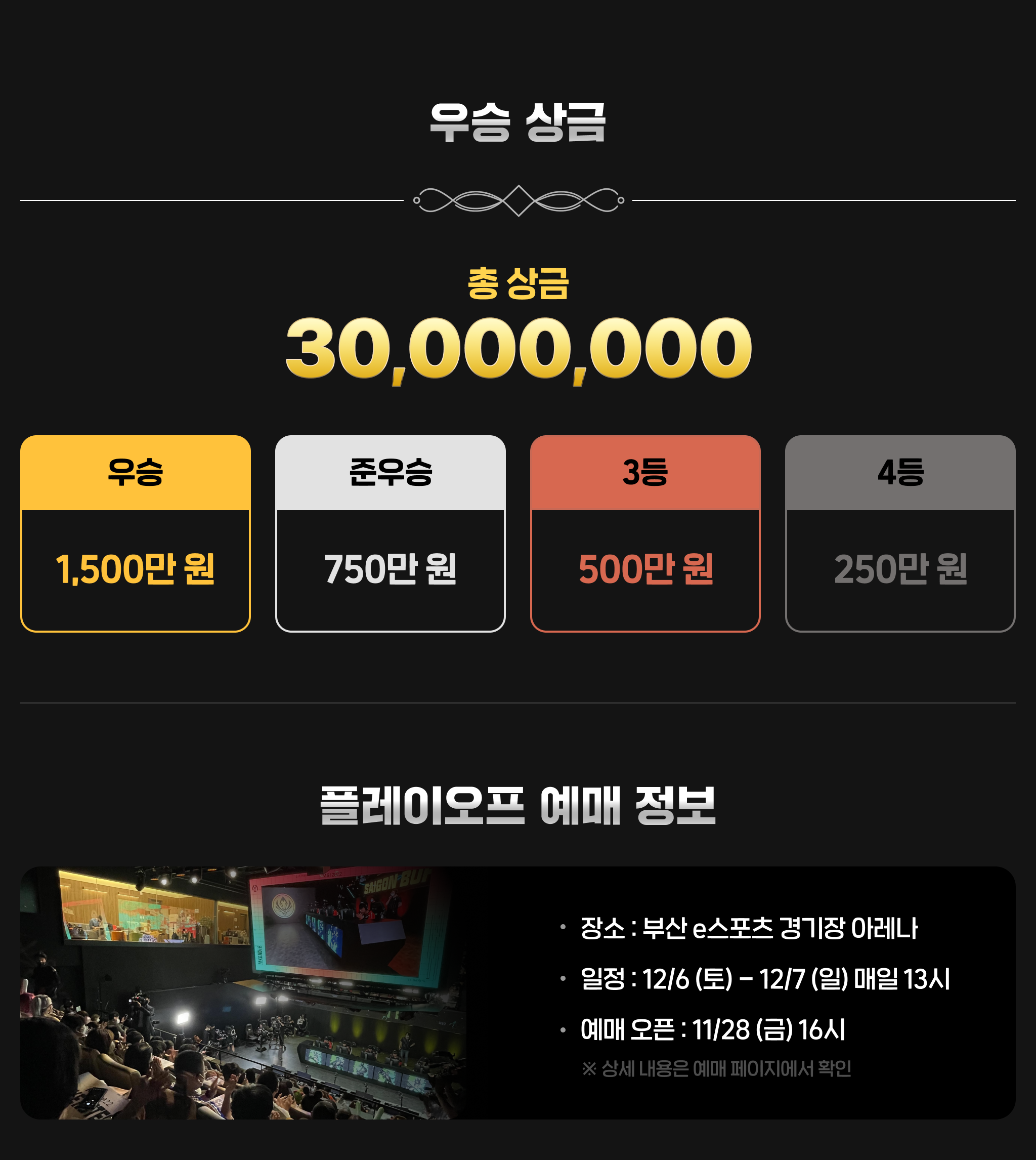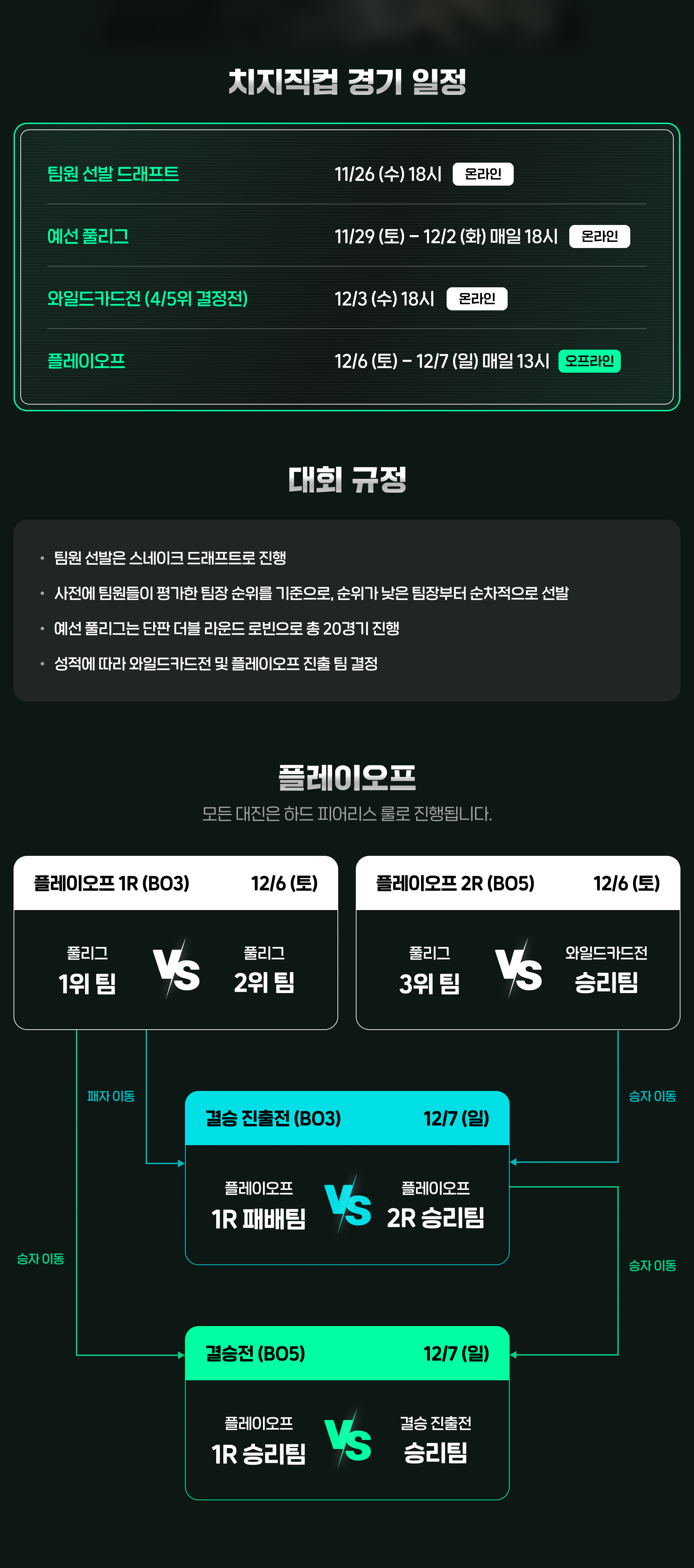 12월 6~7일에는 부산 e스포츠 아레나에서 오프라인 플레이오프가 열리며, 각 팀은 예선을 통해 결정된 순위에 따라 진출하게 됩니다.